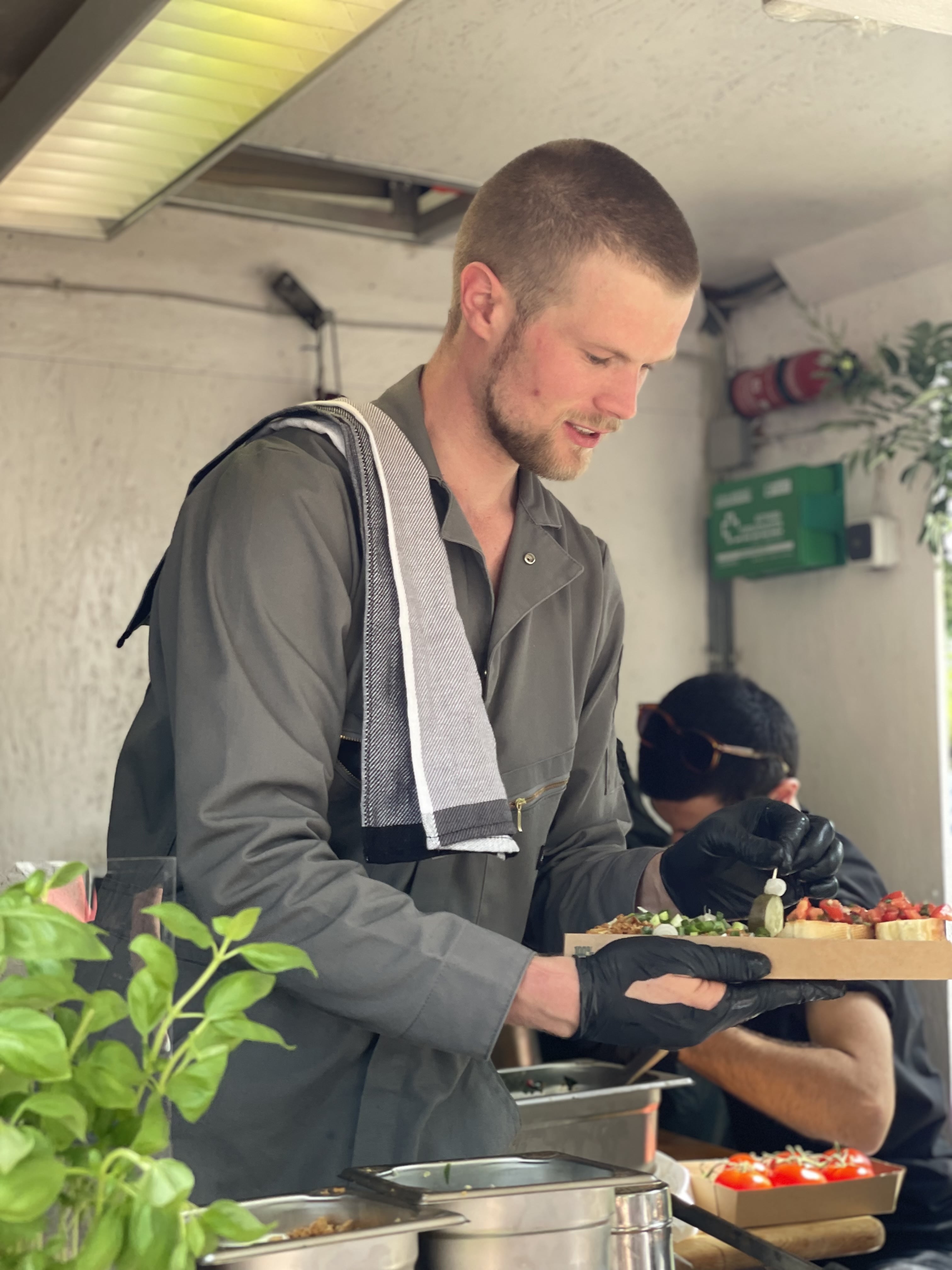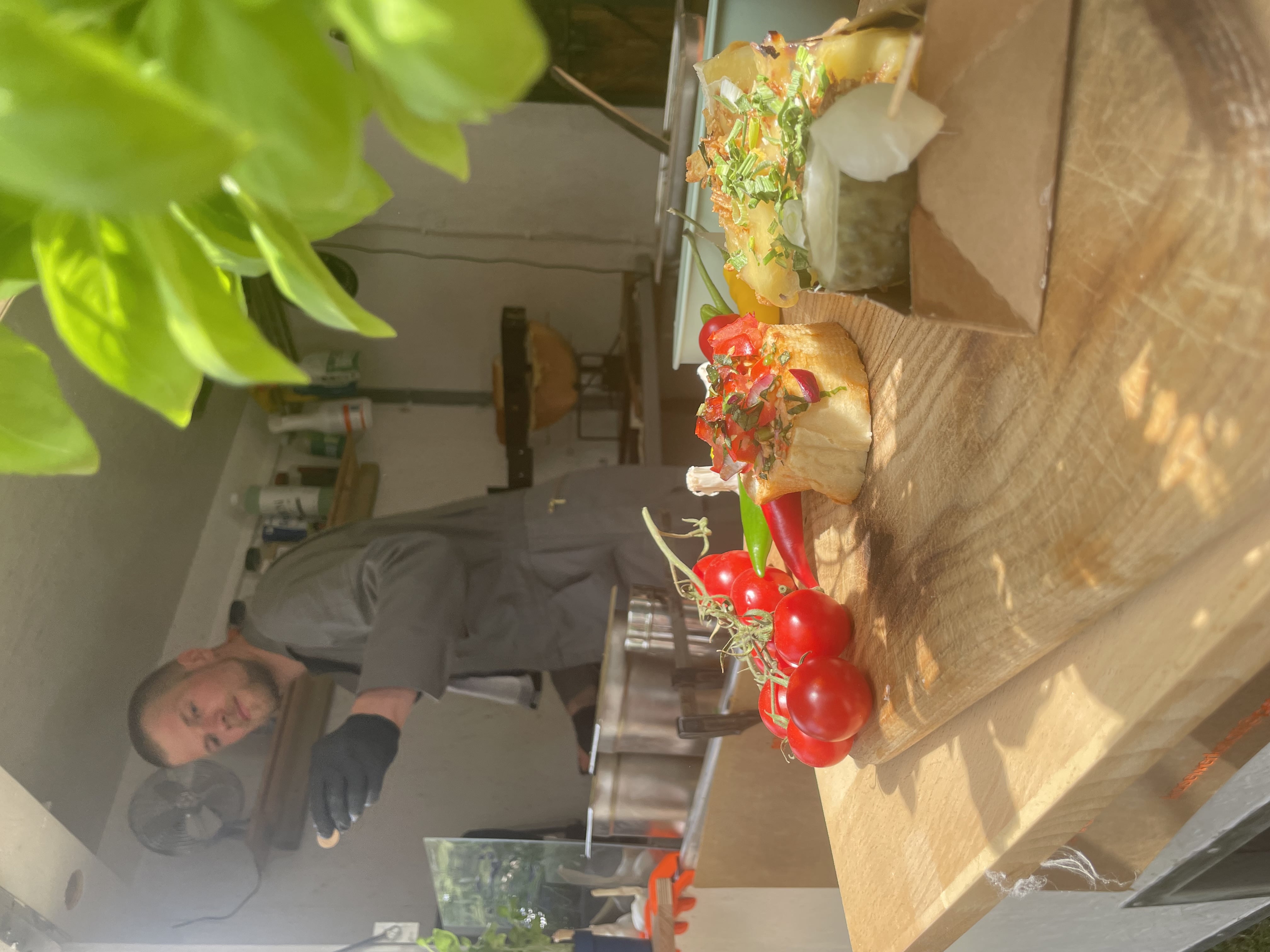 For my debut, I chose raclette on fresh bread—a Swiss dish that's quite popular in Germany. Looking ahead, the trailer will tend more toward vegan offerings, but as a first test, I also sold a bruschetta combo. This turned out perfectly: the weather was hot, the bruschetta provided a light and refreshing option, and I could use the same bread for both dishes.